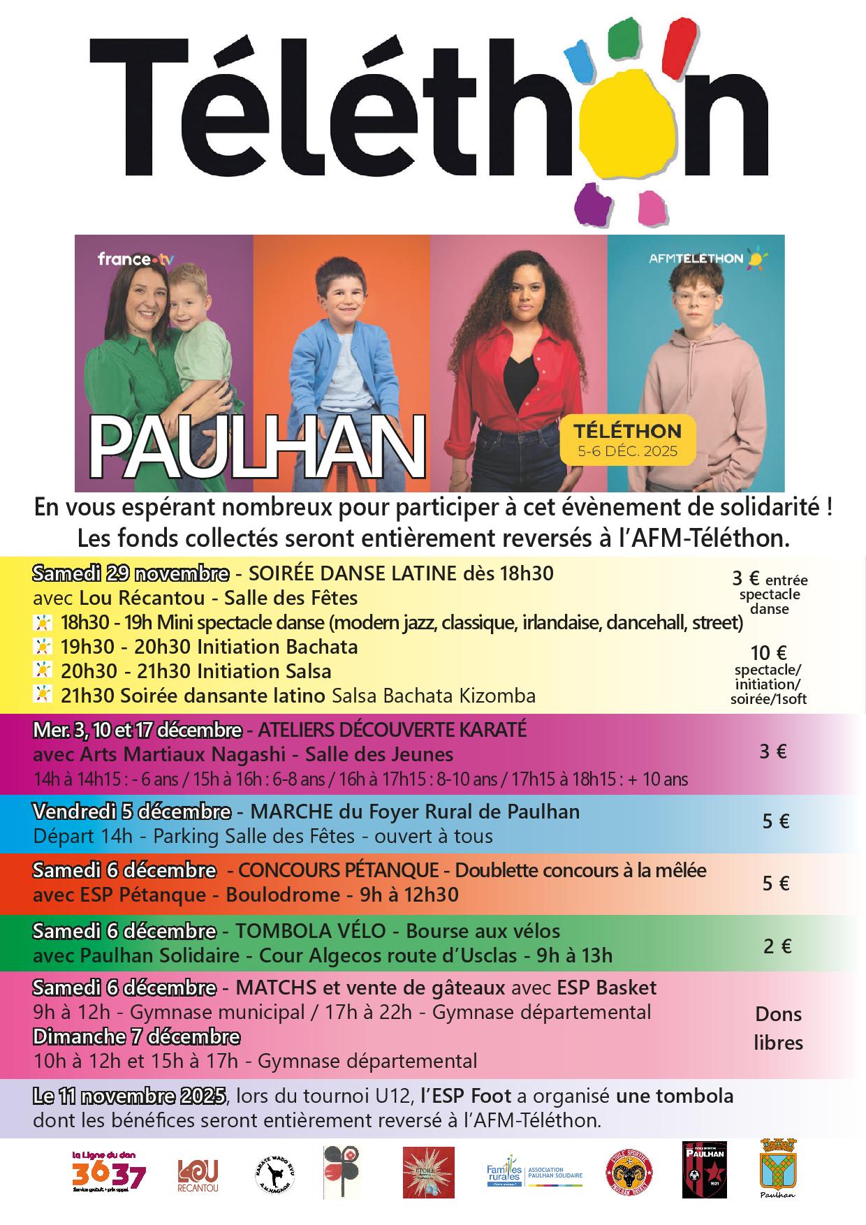 Des bénévoles et partenaires se mobilisent pour le Téléthon 2025. Différentes animations sont prévues, n'hésitez pas à consulter le programme animations Téléthon 2025. Qu’elles soient sportives, culturelles, ou ludiques, destinées aux enfants et aux adultes, ces animations symbolisent l’élan de solidarité du Téléthon. Nous vous espérons nombreuses et nombreux à participer et ainsi faire de cet évènement une réussite ! La totalité des fonds collectés sera reversée à l’AFM-Téléthon. |