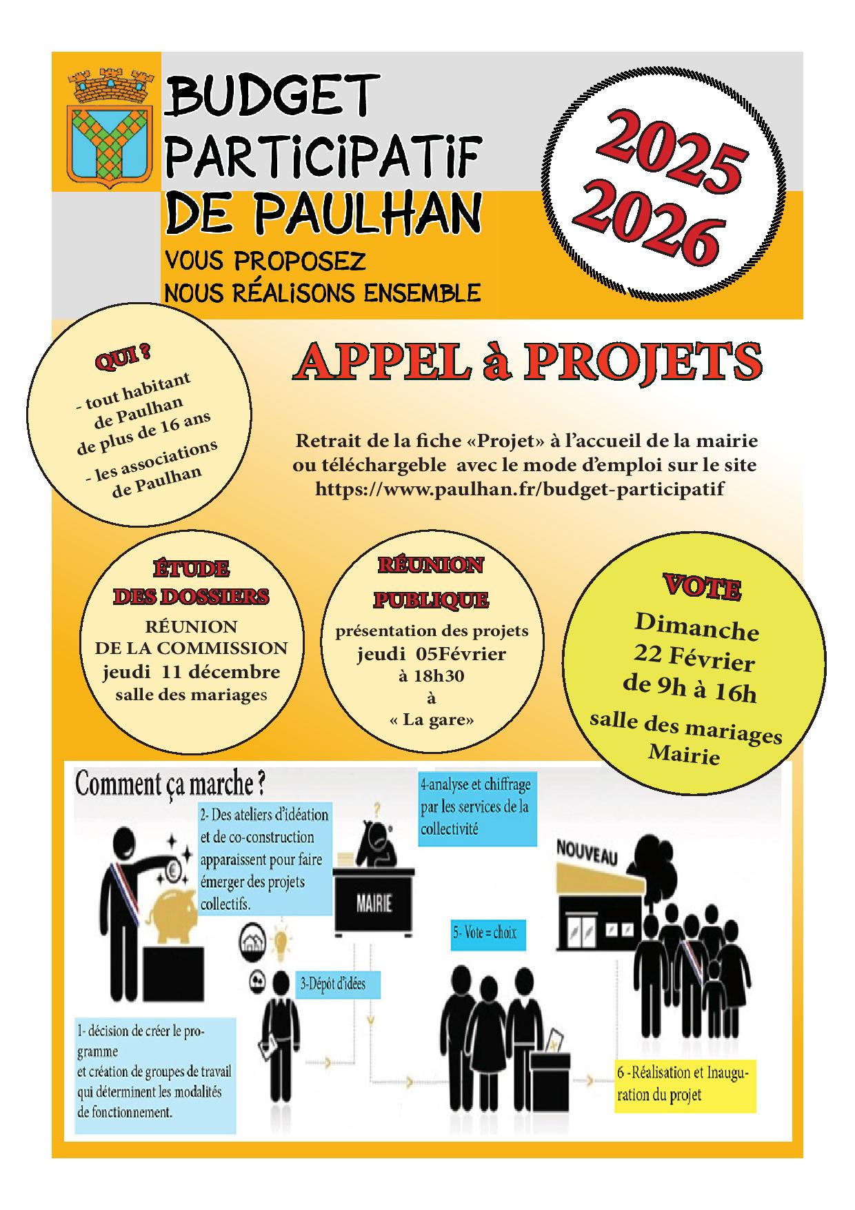 Mode d'emploi Dans le cadre de ses actions conduites en terme de démocratie participative, la commune de PAULHAN a souhaité créer en 2021 un budget participatif afin d’associer les Pauhanais à la politique municipale. A ce titre, elle entend leur donner la possibilité de faire connaitre leur préférence en ce qui concerne l’utilisation d’une partie du budget d’investissement de la commune. La mise en œuvre du budget participatif constitue une innovation démocratique majeure qui permet une expression citoyenne nouvelle, renforçant les liens entre les Paulhanais et leur commune. Ce projet mobilise l’équipe municipale et les agents de l’administration de la commune. Le conseil municipal, dans sa séance du 17 Décembre 2020, a décidé d’allouer la somme de 40 000,00 € au budget participatif 2021. En 2022 cette somme a été maintenue, mais en raison des efforts à faire sur le budget à cause de l'augmentation des charges municipales (électricité, gaz...) elle est passée à 20 000€ pour le budget participatif 2023 . Pour 2025-2026, le montant reste inchangé. Calendrier prévisionnel :